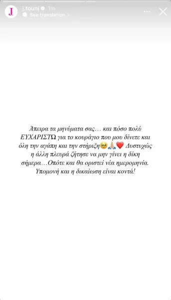 «Άπειρα τα μηνύματά σας… και πόσο πολύ ευχαριστώ για το κουράγιο που μου δίνετε και όλη την αγάπη και την στήριξη. Δυστυχώς, η άλλη πλευρά ζήτησε να μην γίνει η δίκη σήμερα… Οπότε και θα οριστεί νέα ημερομηνία. Υπομονή και η δικαίωση είναι κοντά!»