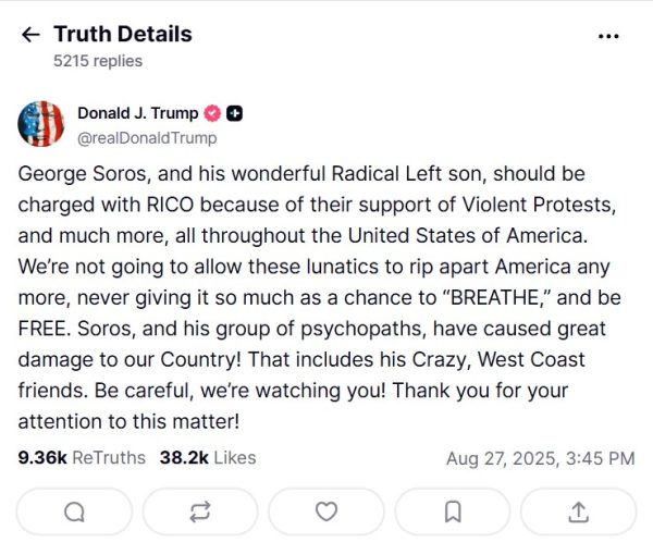 Σε ανάρτησή του στην προσωπική του πλατφόρμα, Truth Social, ο Ρεπουμπλικανός ηγέτης κατηγόρησε τον Σόρος για υποκίνηση αναταραχών και για ενίσχυση ακραίων κινημάτων που, όπως τόνισε, «υπονομεύουν την ασφάλεια και τη σταθερότητα των Ηνωμένων Πολιτειών».