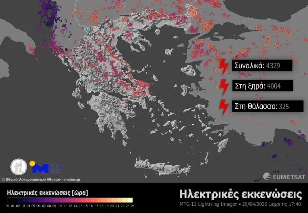 Σύμφωνα με τα στοιχεία του ευρωπαϊκού μετεωρολογικού δορυφόρου τρίτης γενιάς Meteosat-12 και του εξελιγμένου ανιχνευτή Lightning Imager (LI), έως τις 17:40 το απόγευμα είχαν καταγραφεί περισσότερες από 4.000 ηλεκτρικές εκκενώσεις, κυρίως στα ανατολικά και βόρεια ηπειρωτικά τμήματα. Οι ηλεκτρικές εκκενώσεις περιλαμβάνουν κεραυνούς που χτυπούν το έδαφος, εκκενώσεις μεταξύ νεφών και εκκενώσεις μεταξύ νεφών και του αέρα.
