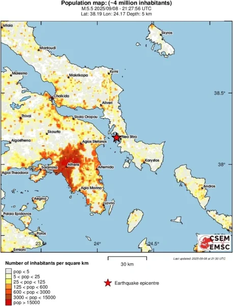 Ισχυρή σεισμική δόνηση μεγέθους 5,5 βαθμών της κλίμακας Ρίχτερ, σύμφωνα με την αυτόματη λύση του Ευρωπαϊκού – Μεσογειακού Σεισμολογικού Ινστιτούτου (EMSC), σημειώθηκε στις 00:27 μετά τα μεσάνυχτα (Τρίτη 9/9), σε περιοχή της νότιας Εύβοιας.