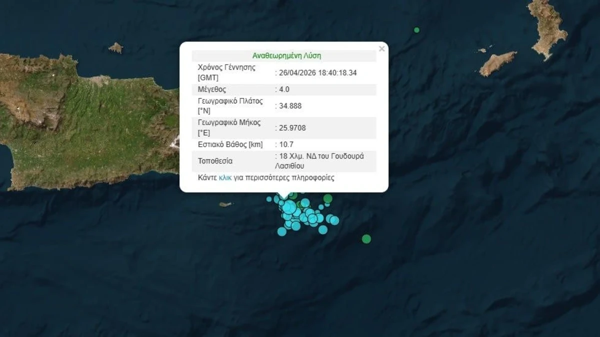 Συνεχίζεται η σεισμική δραστηριότητα στην Κρήτη, καθώς το βράδυ της Κυριακής (26/4) σημειώθηκε σεισμός μεγέθους 4 Ρίχτερ στα ανοιχτά του Λασιθίου.