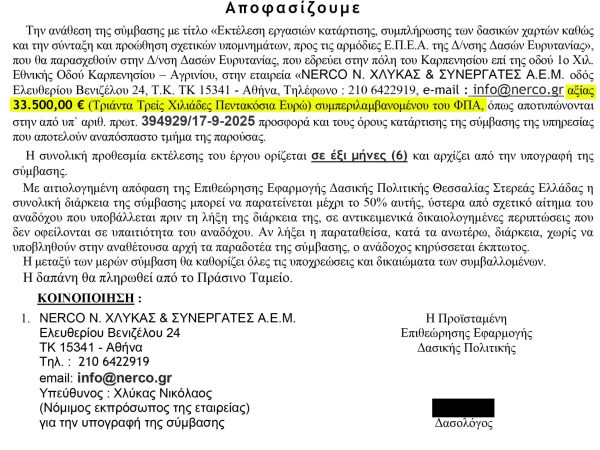 Δεν είναι η πρώτη φορά: η ίδια υπηρεσία του ΥΠΕΝ είχε αναθέσει στη Nerco και άλλα έργα μέσα στο 2025, παρά το γεγονός ότι είχε ήδη ξεσπάσει το σκάνδαλο. Τον Μάιο και τον Ιούνιο, σε Φθιώτιδα και Ανατολική Αττική, η εταιρεία έλαβε συμβάσεις αξίας δεκάδων χιλιάδων ευρώ, ενώ ακόμη και ο Δήμος Φούρνων Κορσεών της ανέθεσε απευθείας την αναμόρφωση δασικού χάρτη τον Ιούνιο, με αμοιβή 24.800 ευρώ.