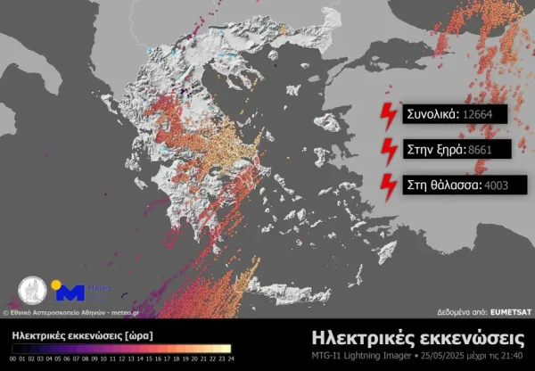 Ηλεκτρικές εκκενώσεις πάνω από την Ελλάδα από το όργανο Lightning Imager του μετεωρολογικού δορυφόρου Meteosat-12, από την αρχή του εικοσιτετραώρου έως τις 21:40 ώρα Ελλάδας:
