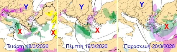 Την Πέμπτη (19/3), προβλέπονται νεφώσεις με τοπικές βροχές και δυτική και νότια χώρα καταιγίδες. Χιόνια θα πέσουν στα ορεινά της ηπειρωτικής Ελλάδας. Οι άνεμοι θα πνέουν: στα δυτικά ΒΑ έως ΝΑ 4 με 6 μποφόρ και στα ανατολικά Β-ΒΑ 6 με 7 και πιθανώς κατά τόπους στο Αιγαίο 8 μποφόρ. Η θερμοκρασία θα σημειώσει μικρή περαιτέρω πτώση.