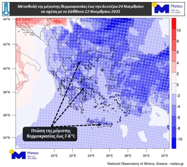 Σύμφωνα με τα τελευταία προγνωστικά δεδομένα του meteo.gr / Εθνικού Αστεροσκοπείου Αθηνών, η πτώση θα αρχίσει να γίνεται αισθητή κυρίως από το μεσημέρι της Κυριακής 23/11. Στον σχετικό χάρτη παρουσιάζεται η πτώση της μέγιστης θερμοκρασίας έως τη Δευτέρα 24/11 σε σχέση με τις μέγιστες που αναμένονται το μεσημέρι του Σαββάτου 22/11.