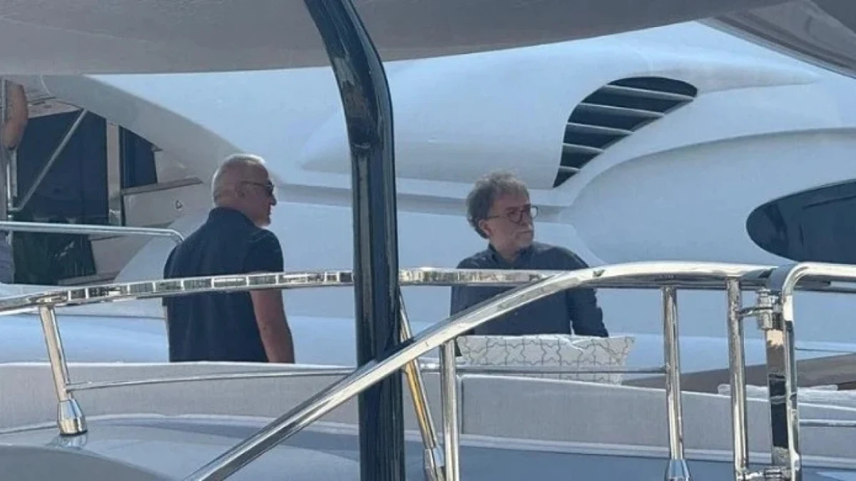 Ο υπουργός επιβεβαίωσε ότι βρισκόταν στο γιοτ για να δώσει συνέντευξη στον αρθρογράφο Αχμέτ Χακάν (είναι δεξιά στη φωτογραφία, αριστερά ο υπουργός), αλλά κατά τους επικριτές του το ταξίδι μοιάζει περισσότερο με διακοπές παρά με επαγγελματική υποχρέωση.