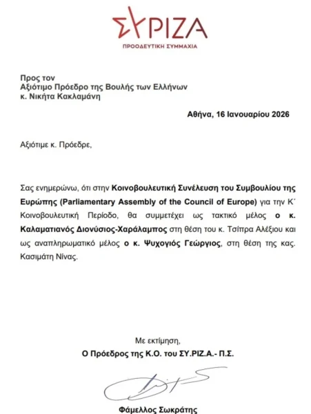Με επιστολή του προς τον Πρόεδρο της Βουλής Νικήτα Κακλαμάνη, ο κ. Φάμελλος ανακοίνωσε όστι στην Κοινοβουλευτική Συνέλευση του Συμβουλίου της Ευρώπης (Parliamentary Assembly of the Council of Europe), για την Κ΄ Κοινοβουλευτική Περίοδο, ως τακτικό μέλος θα μετέχει ο Διονύσης Καλαματιανός και ως αναπληρωματικό ο Γιώργος Ψυχογιός. Μέχρι σήμερα, εκπρόσωπος του ΣΥΡΙΖΑ ήταν ο Αλέξης Τσίπρας, που έχει παραιτηθεί από τη βουλευτική του έδρα και αναπληρωματικό μέλος η κυρία Κασιμάτη.