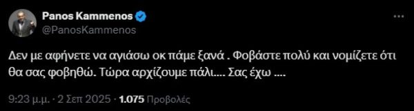 Λίγες ώρες αργότερα, ο κ. Καμμένος ανάρτησε στο Twitter: «Δεν με αφήνετε να αγιάσω. Οκ, πάμε ξανά. Φοβάστε πολύ και νομίζετε ότι θα σας φοβηθώ. Τώρα αρχίζουμε πάλι…. Σας έχω ….»