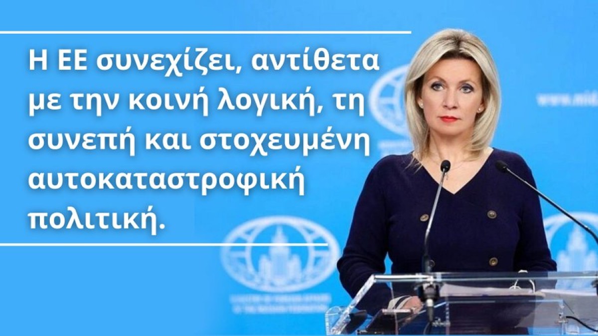 Καταστρέφοντας τους δεσμούς μας στον ενεργειακό τομέα, η ΕΕ συνεχίζει τη συνεπή αυτοκαταστροφική πολιτική» δήλωσε χαρακτηριστικά η Ρωσίδα διπλωμάτης.
