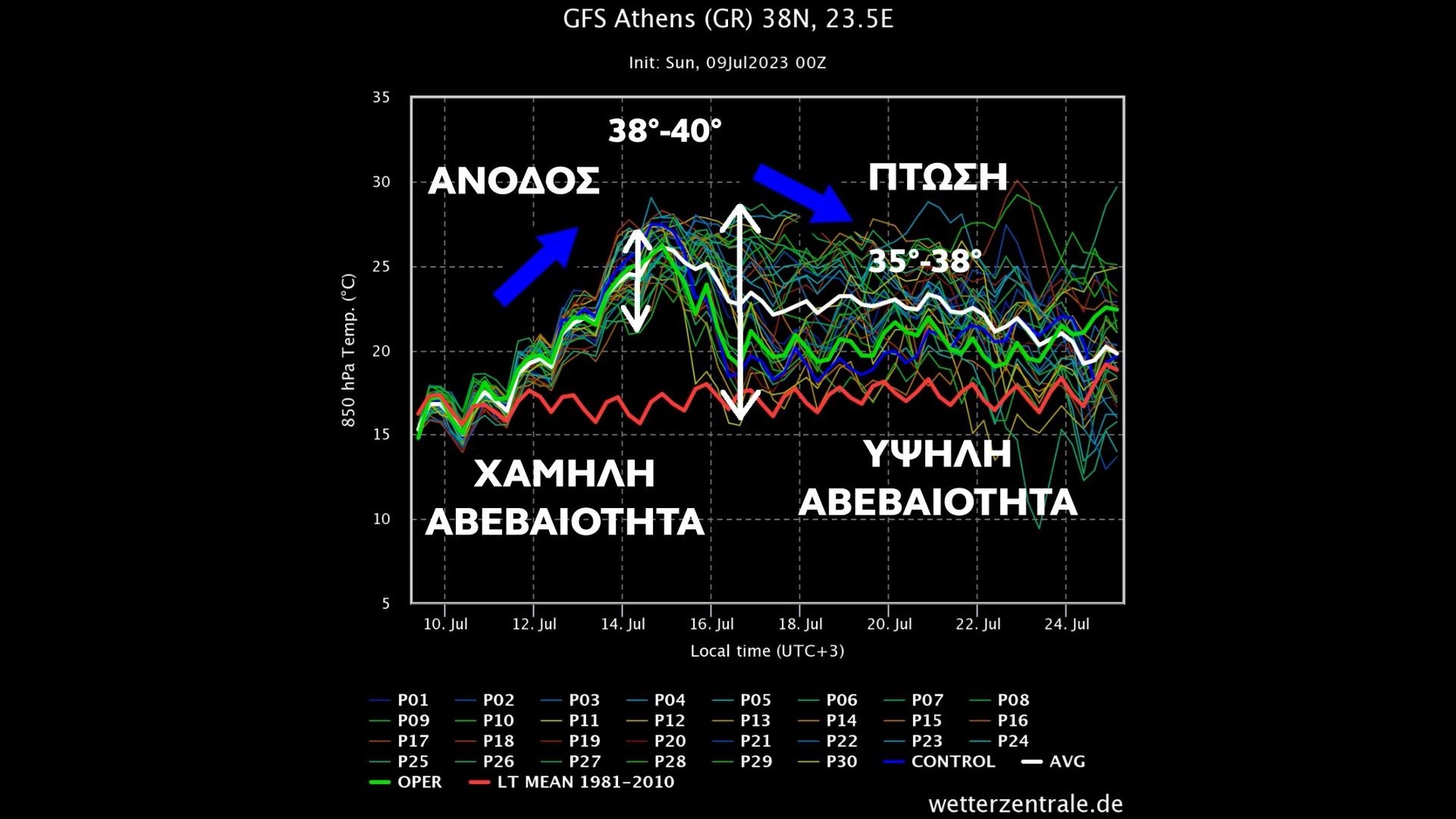 Ο γρίφος γίνεται αρκετά περίπλοκος αν κάποιος επιχειρήσει να δώσει μία εκτίμηση από την άλλη Δευτέρα και μετά, τουλάχιστον στο θέμα καύσωνα. Αυτό γίνεται έντονα αντιληπτό βλέποντας το κατακόρυφο λευκό βέλος που έχουμε σημειώσει να αυξάνει σημαντικά που σημαίνει και αύξηση της αβεβαιότηταw.