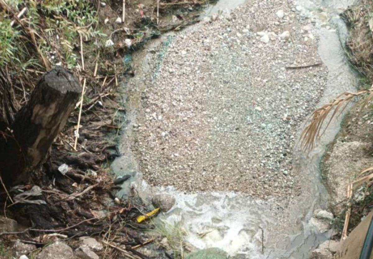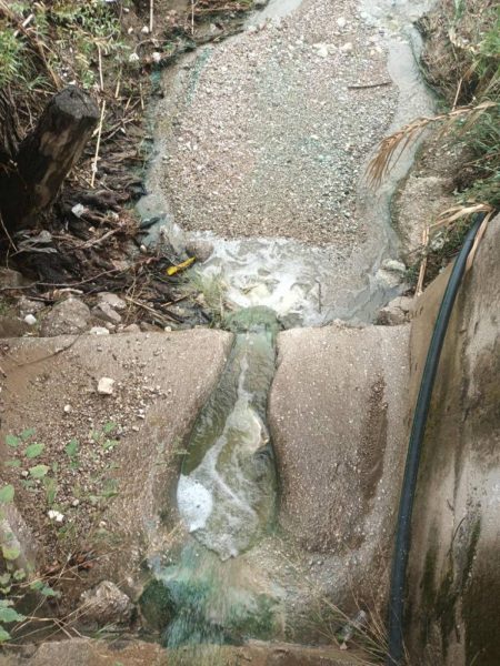 Το χρωματισμένο νερό φαίνεται να προέρχεται από αγωγό απορροής, ο οποίος το διοχετεύει σε τσιμεντένιο αυλάκι πριν αυτό καταλήξει στην κοίτη του ρέματος. Κατά μήκος της διαδρομής, το πράσινο χρώμα παραμένει εμφανές, βάφοντας πέτρες, λάσπες και βλάστηση.