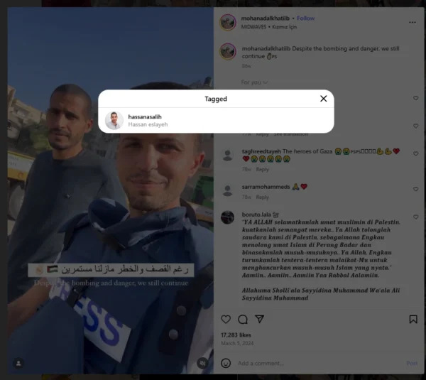 Ιδιαίτερη αίσθηση προκάλεσαν και αναρτήσεις στις οποίες χαρακτήριζε τον Hassan Eslaieh – δημοσιογράφο και στέλεχος της Χαμάς – ως «φίλο και σύντροφο από την αρχή του πολέμου». Σε φωτογραφικό υλικό, ο Eslaieh εμφανίζεται στο προσκήνιο, ενώ στο βάθος διακρίνεται ο Alkhatib τις ώρες της εισβολής στο Ισραήλ.