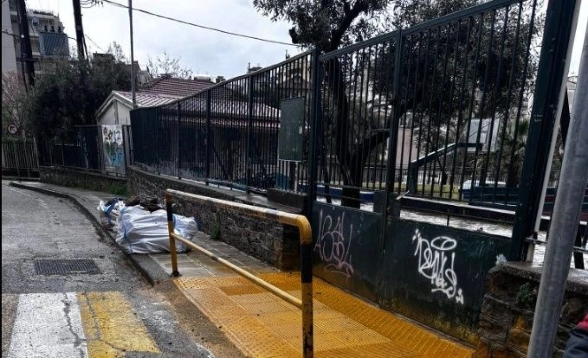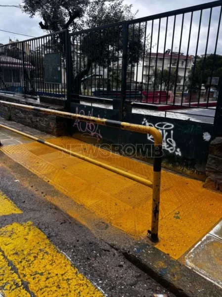 Η τοποθέτηση της μπάρας, που λειτουργεί προστατευτικά για την έξοδο των μαθητών, ακυρώνει στην πράξη τον σκοπό της ράμπας και της πρόσβασης στο πεζοδρόμιο σε έναν κεντρικό δρόμο της πόλης στην περιοχή της Αγίας Τριάδας.