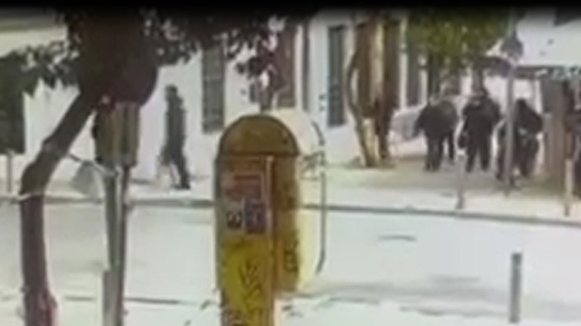 Στην πρώτη περίπτωση ο «αρχηγός» φαίνεται πως φυλάει τσίλιες ενώ οι δράστες εμφανίζονται από τον πεζόδρομο και προχωρούν με σταθερό βήμα. Ορισμένοι κρατούν στα χέρια τους κράνη για να καλύψουν το πρόσωπό τους.