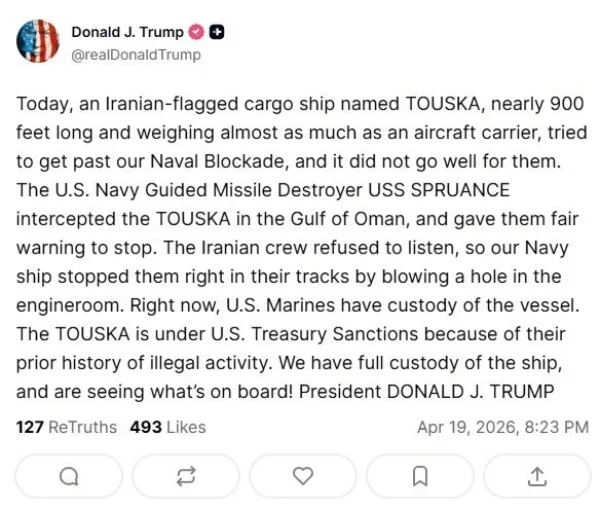 «Το αντιτορπιλικό USS SPRUANCE του Πολεμικού Ναυτικού των ΗΠΑ αναχαίτισε το TOUSKA στον Κόλπο του Ομάν και τους έδωσε εύλογη προειδοποίηση να σταματήσουν. Το ιρανικό πλήρωμα αρνήθηκε να ακούσει, οπότε το πλοίο του Πολεμικού Ναυτικού μας τους σταμάτησε αμέσως ανοίγοντας μια τρύπα στο μηχανοστάσιο», έγραψε στο Truth Social.