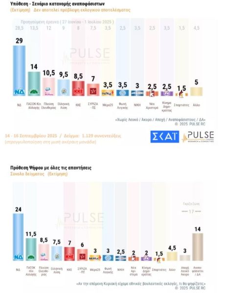 Σύμφωνα με τη δημοσκόπηση της Pulse, για λογαριασμό του ΣΚΑΪ, η Νέα Δημοκρατία, λίγα 24ωρα μετά τις ανακοινώσεις του Κυριάκου Μητσοτάκη στην 89η ΔΕΘ, εμφανίζεται με αναγωγή στο 29% (+0,5% σε σχέση την μέτρηση στα τέλη Ιουνίου, αρχές Ιουλίου), έναντι 14% που συγκεντρώνει το ΠΑΣΟΚ (+0,5% σε σχέση την μέτρηση στα τέλη Ιουνίου, αρχές Ιουλίου).