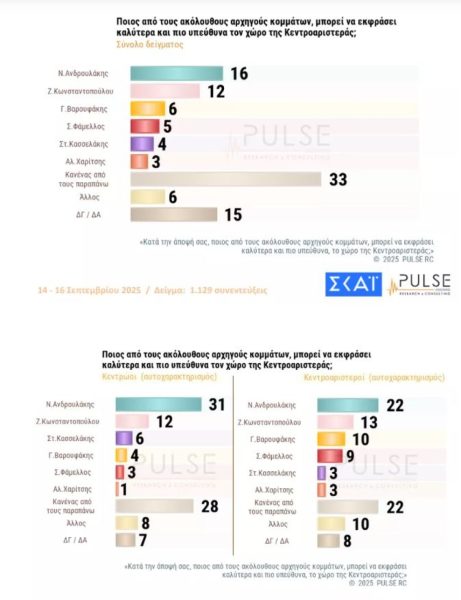 Η δημοσκόπηση της Pulse έθεσε και το ερώτημα για τον καλύτερο εκφραστή της κεντροδεξιάς, στο πλαίσιο της συζήτησης για τη δημιουργία ενός φορέα, που θα περιλαμβάνει όλα τα κόμματα από το κέντρο προς τα αριστερά, ως αντιστάθμισμα στη δυναμική της Νέας Δημοκρατίας.
