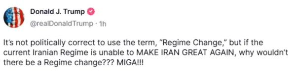 Σε ανάρτησή του στην πλατφόρμα Truth Social, ο Αμερικανός πρόεδρος έγραψε πως «δεν είναι πολιτικά ορθή η χρήση του όρου ‘αλλαγή καθεστώτος’, αλλά αν το σημερινό ιρανικό καθεστώς είναι ανίκανο ΝΑ ΞΑΝΑΔΩΣΕΙ ΣΤΟ ΙΡΑΝ ΤΟ ΜΕΓΑΛΕΙΟ ΤΟΥ, γιατί να μην υπάρξει αλλαγή καθεστώτος; MIGA!!! (σ.σ. Make Iran Great Again)», παραφράζοντας το σλόγκαν του MAGA (Make America Great Again, «Να ξαναδώσουμε στην Αμερική το μεγαλείο της»).