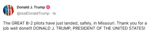 Ακολούθως μέσω άλλης ανάρτησης στην ίδια πλατφόρμα, ιδιοκτησία του, ο πρόεδρος Τραμπ ενημέρωσε πως «οι σπουδαίοι πιλότοι των B-2 μόλις προσγειώθηκαν, με ασφάλεια, στο Μιζούρι», ευχαριστώντας τους που έφεραν σε πέρας την αποστολή στο Ιράν.