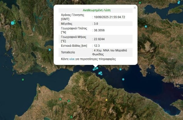 Σχεδόν την ίδια ώρα στη Φωκίδα και συγκεκριμένα 4 χιλιόμετρα νότια/νοτιοανατολικά του Μαραθιά (σε θαλάσσια περιοχή στον Κορινθιακό) οι σεισμογράφοι κατέγραφαν επίσης δόνηση 3 Ρίχτερ, με εστιακό βάθος τα 12,3 χιλιόμετρα.