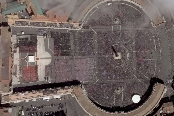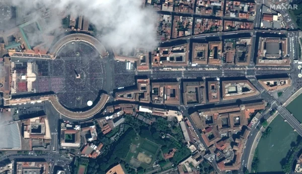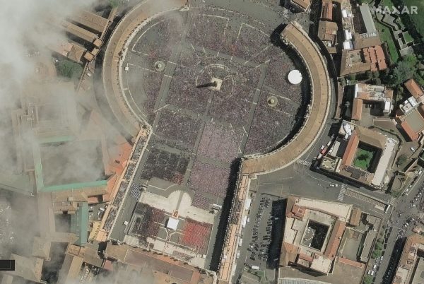 Δορυφορικές εικόνες που διατέθηκαν από την Maxar Technologies δείχνουν την πλατεία του Αγίου Πέτρου κατά τη διάρκεια της νεκρώσιμης λειτουργίας του Πάπα Φραγκίσκου, στην πόλη του Βατικανού.