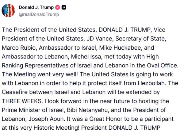 Σε ανάρτησή του λίγο μετά τα μεσάνυχτα, ο Αμερικανός πρόεδρος ανέφερε ότι η συνάντηση μεταξύ των δύο αντιπροσωπειών «πήγε πολύ καλά», προσθέτοντας ότι οι ΗΠΑ θα συνεργαστούν με τον Λίβανο ώστε να μπορέσει «να προστατευθεί από τη Χεζμπολάχ».