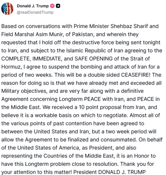 Σε μια κίνηση που αλλάζει τα δεδομένα στο παρά ένα της ανεξέλεγκτης κλιμάκωσης στη Μέση Ανατολή, ο Ντόναλντ Τραμπ ανακοίνωσε ότι αποδέχεται την πρόταση του Πακιστάν και προχωρά σε αναστολή των βομβαρδισμών κατά του Ιράν για διάστημα δύο εβδομάδων.