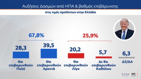 Σε ό,τι αφορά του δασμούς, το 67,8% ανησυχεί ότι θα προκαλέσει αυξήσεις στις τιμές των προϊόντων στην Ελλάδα ενώ το 25,9% δηλώνει ότι δεν θα υπάρξουν επιβαρύνσεις. Στο ερώτημα για το 12ετές εξοπλιστικό πρόγραμμα που παρουσίασε η κυβέρνηση το 36,6% δηλώνει ότι πρέπει να υλοποιηθεί έναντι 48,3% που πιστεύει ότι τα χρήματα θα πρέπει να διατεθούν για τις κοινωνικές ανάγκες σε υγεία, παιδεία κλπ.