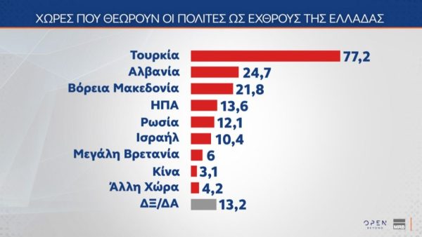 Ταυτόχρονα ανάμεσα στις πλέον εχθρικές χώρες οι ερωτηθέντες εκτός της Τουρκίας κατατάσσουν τις Αλβανία, Σκόπια και… ΗΠΑ.