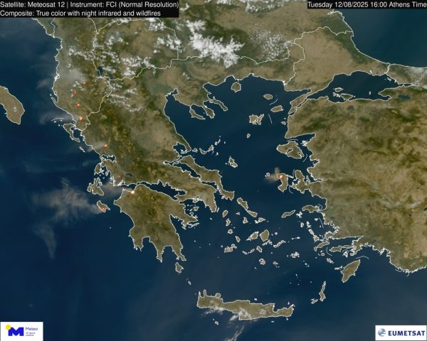 Συγκεκριμένα, η δορυφορική εικόνα κατέγραψε τα ενεργά μέτωπα των μεγαλύτερων πυρκαγιών στις 16:00 της Τρίτης (12/08) σε Ελλάδα και Αλβανία.