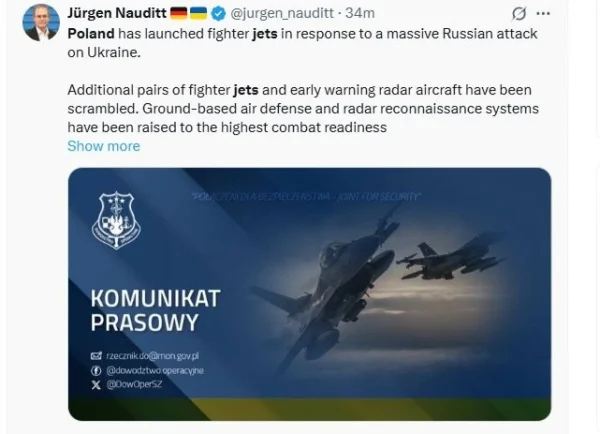 «Προσοχή. Λόγω των επιθέσεων της Ρωσικής Ομοσπονδίας σε στόχους που βρίσκονται σε ουκρανικό έδαφος, η πολωνική και συμμαχική αεροπορία επιχειρεί στον εναέριο χώρο μας. Ζεύγη μαχητικών αεροσκαφών και αεροσκαφών έγκαιρης προειδοποίησης που βρίσκονται σε υπηρεσία έχουν απογειωθεί», ανέφεραν οι Πολωνικές Ένοπλες Δυνάμεις. Είναι επίσης γνωστό ότι τα επίγεια συστήματα αεράμυνας και ραντάρ της Πολωνίας, καθώς και τα συστήματα αναγνώρισης μεγάλου βεληνεκούς, έχουν τεθεί σε κατάσταση μέγιστης ετοιμότητας.