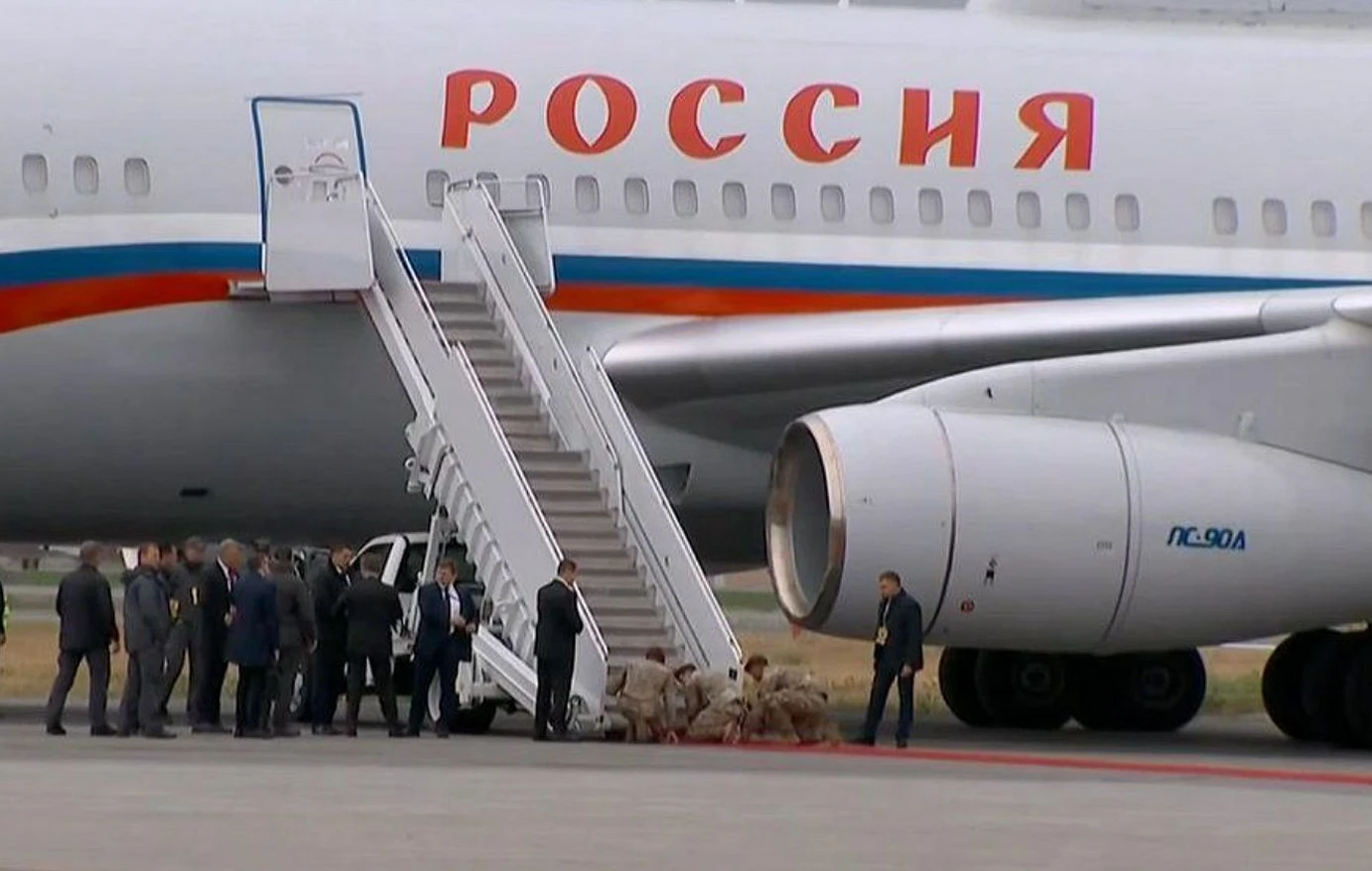 Βίντεο που δείχνει Αμερικανούς στρατιώτες να γονατίζουν πάνω στο χαλί κάτω από το αεροσκάφος του Πούτιν, στο οποίο δεσπόζει η λέξη “РОССИЯ” (RUSSIA με κυριλλικά γράμματα), αναρτήθηκε στο Telegram από το ρωσικό ειδησεογραφικό κανάλι Zvezda («Αστέρι»), το οποίο ανήκει στο ρωσικό υπουργείο Άμυνας.