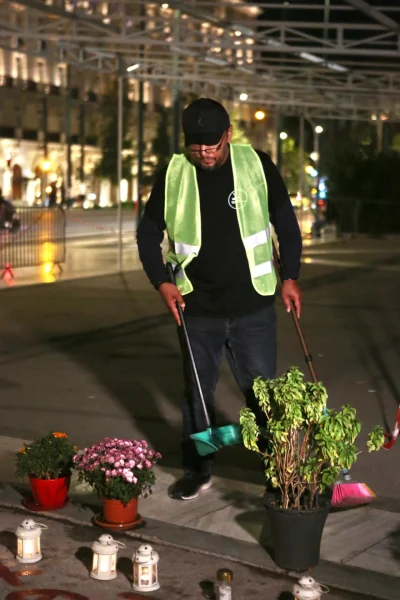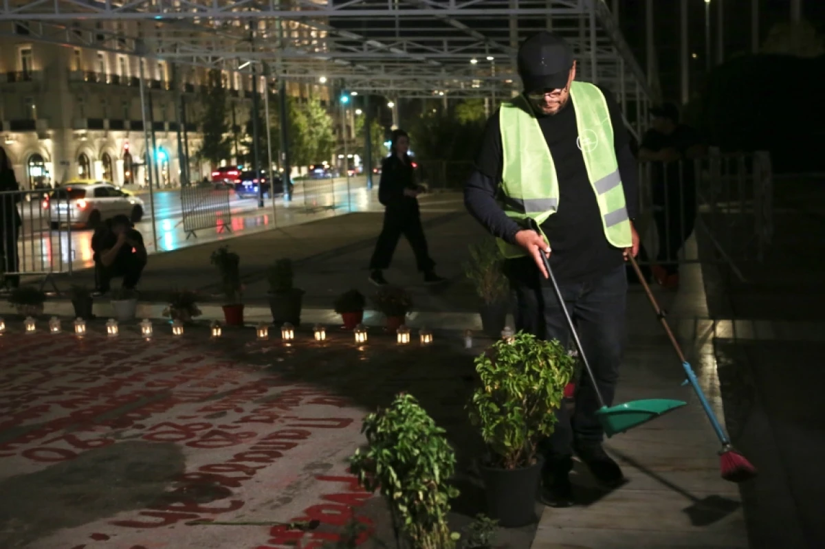 Το βράδυ της Κυριακής, περίπου 30 με 40 άτομα που συμμετέχουν σε κινήσεις αλληλεγγύης συγκεντρώθηκαν στο Μνημείο του Αγνώστου Στρατιώτη, στο σημείο όπου είναι χαραγμένα τα 57 ονόματα των θυμάτων της τραγωδίας των Τεμπών, για να καθαρίσουν τον χώρο.