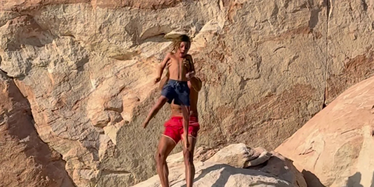 «Αυτό ΔΕΝ είναι γονική συμβουλή. Αυτό ΔΕΝ είναι κάτι που σας συμβουλεύω να δοκιμάσετε. Επίσης, αυτό ΔΕΝ είναι κάτι που κάναμε με όλα τα παιδιά μας. Κάθε παιδί είναι αρκετά διαφορετικό, οπότε ο τρόπος που γινόμαστε γονείς, πειθαρχούμε και διδάσκουμε το ΠΩΣ ΝΑ ΠΗΔΑΜΕ ΑΠΟ ΕΝΑΝ ΒΡΑΧΟ είναι αρκετά διαφορετικός 🙂 Σίγουρα η 1η προτεραιότητα είναι η ασφάλεια. Η 2η είναι να μάθεις ότι ΜΠΟΡΕΙΣ να κάνεις δύσκολα πράγματα. Η 3η είναι να διασκεδάζεις 🙂 Λοιπόν, μιλώντας για την πρώτη προτεραιότητα, την ασφάλεια… Πήγαμε τον μικρό μας Cali σε έναν βράχο που ξέραμε ότι θα ήταν ασφαλής. Πραγματικά ο μεγαλύτερος κίνδυνος θα ήταν αν δίσταζε, δεν πηδούσε μακριά και έπεφτε από την πλευρά του βράχου. Έτσι, για να είμαστε ιδιαίτερα ασφαλείς, επειδή ήθελε να πηδήξει αλλά δεν αισθανόταν σίγουρος… Τον πέταξα. Τελικά ένα αετόπουλο πρέπει να φύγει από τη φωλιά…ή να το πετάξουν από τη φωλιά 😉 και να μάθει ότι ΜΠΟΡΕΙ ΝΑ ΠΕΤΑΞΕΙ! Αλλά προειδοποίηση: Το να μαθαίνετε στα παιδιά σας να είναι γενναία αρχίζει να γυρίζει μπούμερανγκ όταν μεγαλώνουν και αρχίζουν να πηδούν από ύψη που ούτε εσείς δεν τολμάτε!!! /// ΝΑ ΕΙΣΤΕ ΑΣΦΑΛΕΙΣ ΕΚΕΙ ΕΞΩ! ΜΠΟΡΕΙΤΕ ΝΑ ΚΑΝΕΤΕ ΔΥΣΚΟΛΑ ΠΡΑΓΜΑΤΑ! ΔΙΑΣΚΕΔΑΣΤΕ! – @thebucketlistfamily».