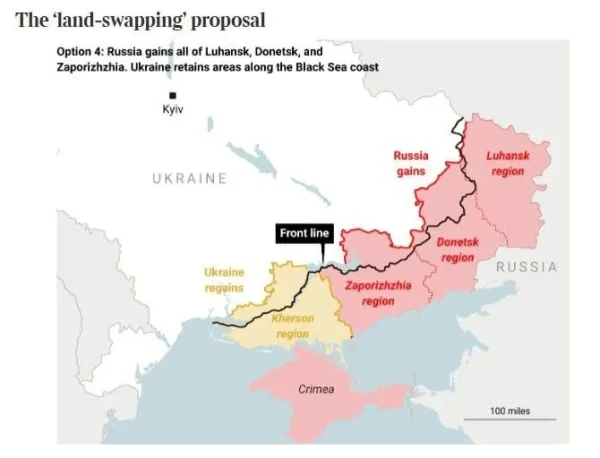4. Εδαφική ανταλλαγή: Η Ρωσία λαμβάνει όλο το Ντονμπάς, η Ουκρανία επιστρέφει μέρος της Χερσώνας. Απίθανο, καθώς η περιοχή της Χερσώνας είναι ζωτικής σημασίας για την σύνδεση της Ρωσίας με την Κριμαία.