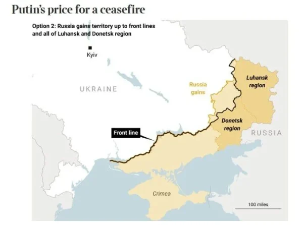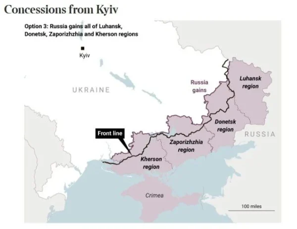 3. Παραχωρήσεις από το Κίεβο: Η Ουκρανία παραχωρεί Λουχάνσκ, Ντόνετσκ, Ζαπορίζια και Χερσώνα ακόμη και τα εδάφη που η Ρωσία δεν ελέγχει ακόμη πλήρως.