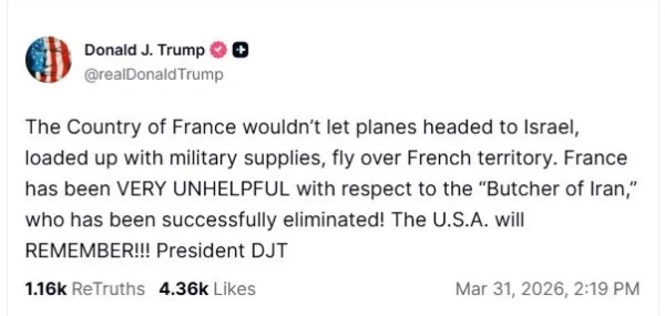 Στο τελευταίο ξέσπασμά του, στα μέσα κοινωνικής δικτύωσης, σε ανάρτησή του στο Truth Social, έγραψε: «Η Γαλλία δεν επέτρεψε σε αεροσκάφη με προορισμό το Ισραήλ, φορτωμένα με στρατιωτικό εξοπλισμό, να περάσουν πάνω από το γαλλικό έδαφος. Η Γαλλία ήταν ΠΟΛΥ ΜΥ ΣΥΝΕΡΓΑΣΙΜΗ όσον αφορά τον “χασάπη του Ιράν”, ο οποίος τελικά εξοντώθηκε! Οι ΗΠΑ θα το ΘΥΜΗΘΟΥΝ!!! Πρόεδρος DJT».