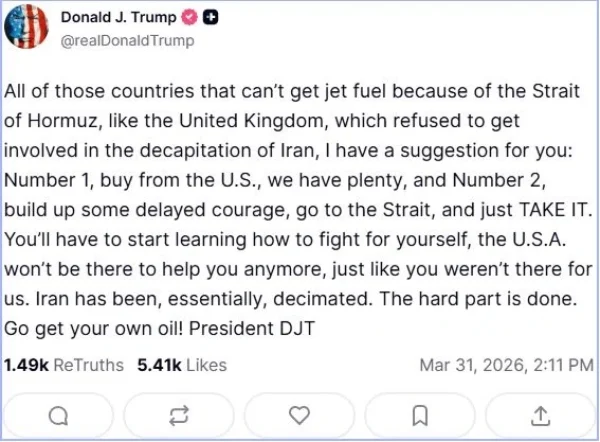 Εννιά λεπτά νωρίτερα είχε απευθυνθεί με έντονο τόνο στους υπόλοιπους συμμάχους λέγοντάς τους, «Πηγαίνετε μόνοι σας στα Στενά του Ορμούζ για το πετρέλαιο – Οι ΗΠΑ δεν θα είναι εκεί για να βοηθήσουν».