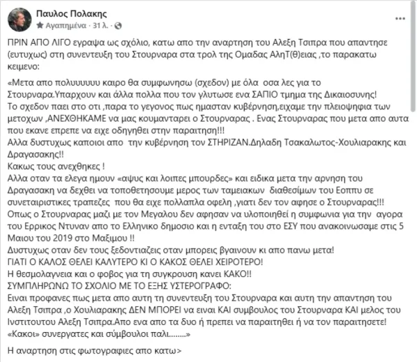 Στη διαμάχη επανήλθαν και πηγές της Αμαλίας, οι οποίες σχολίασαν σκωπτικά την απάντηση του Διοικητή, ενώ παρέμβαση έκανε και ο Παύλος Πολάκης, ο οποίος δήλωσε ότι συμφωνεί — έστω εν μέρει — με την κριτική προς τον κ. Στουρνάρα, αφήνοντας ταυτόχρονα αιχμές για πρώην κυβερνητικούς συνεργάτες.