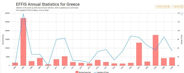 Οι ετήσιες στατιστικές για τις πυρκαγιές στην Ελλάδα από το 2006 έως σήμερα (European Forest Fire Information System)