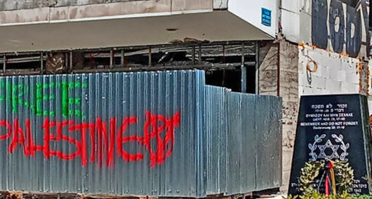 Άγνωστοι έγραψαν το σύνθημα «Free Palestine» με τα χρώματα της παλαιστινιακής σημαίας σε λαμαρίνες παρακείμενου κτιρίου, δίπλα από το μνημείο του Ολοκαυτώματος των Εβραίων Καβαλιωτών.