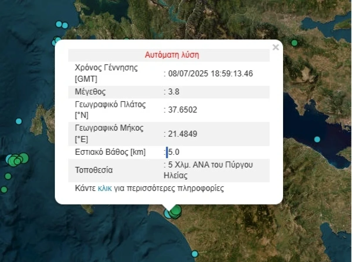 Σεισμός μεγέθους 3,8 της κλίμακας Ρίχτερ σημειώθηκε απόψε (08/07) στον Πύργο Ηλείας.
