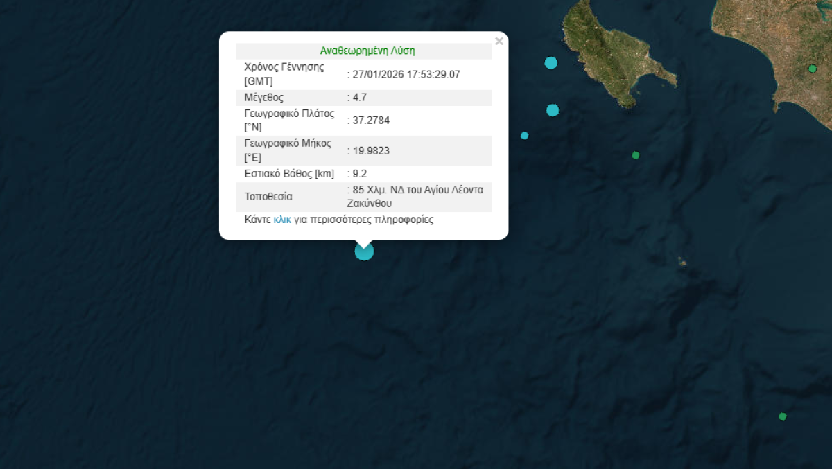 Συγκεκριμένα, σύμφωνα με το Γεωδυναμικό Ινστιτούτο το επίκεντρο της δόνησης ήταν στα 85 χιλιόμετρα ΝΔ του Αγίου Λέοντα Ζακύνθου.