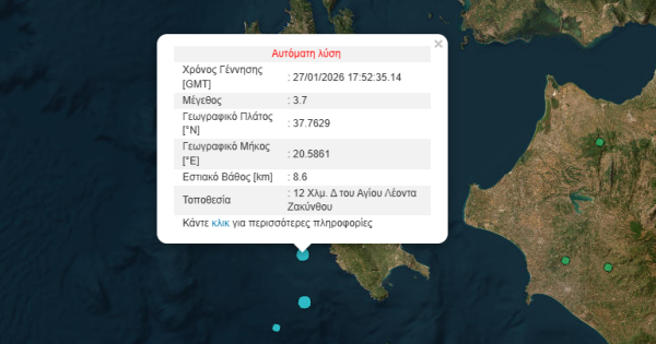 Στο μεταξύ, είχε προηγηθεί σεισμική δόνηση μεγέθους 3,7 Ρίχτερ στα 12 χιλιόμετρα δυτικά του Αγίου Λέοντα Ζακύνθου, με το εστιακό βάθος να είναι στα 8,6 χιλιόμετρα.