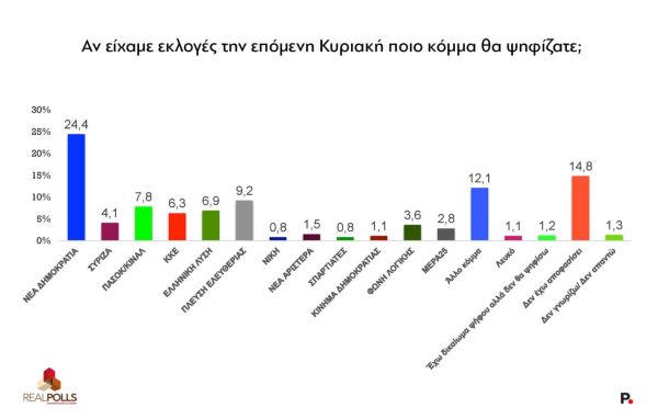 Τα στοιχεία της έρευνας της RealPolls για το Protagon, που διεξήχθη στις 11 και 12 Ιανουαρίου, σκιαγραφούν μια πολιτική πραγματικότητα που μοιάζει παγωμένη στην κορυφή αλλά αποσυντεθειμένη στη βάση της. Η Νέα Δημοκρατία παραμένει πρώτη, ωστόσο εξακολουθεί να κινείται κάτω από το ψυχολογικό όριο του 25% στην πρόθεση ψήφου, καταγράφοντας 24,4%, παρά τη μικρή άνοδο σε σχέση με τον Δεκέμβριο. Στην εκτίμηση εκλογικού αποτελέσματος φτάνει το 28,7%, ποσοστό αισθητά χαμηλότερο από τις επιδόσεις της στις εθνικές εκλογές του 2023.