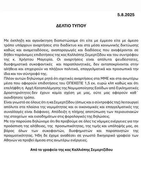 «Με έκπληξη και αγανάκτηση διαπιστώσαμε ότι είτε με έμμεσο είτε με άμεσο τρόπο υπάρχουν αναρτήσεις στο διαδίκτυο και στα μέσα κοινωνικής δικτύωσης καθώς και αναμεταδόσεις, αναπαραγωγές και διαδόσεις που αναφέρονται σε δήθεν παράνομες επιδοτήσεις της κας Καλλιόπης Σεμερτζίδου και του συντρόφου της κ. Χρήστου Μαγειρία. Οι αναρτήσεις είναι απόλυτα ψευδέστατες, δυσφημιστικά συκοφαντικές και παραπλανητικές, δεν ανταποκρίνονται στην αλήθεια και επιχειρούν να πλήξουν πολιτικά, επαγγελματικά και προσωπικά την ίδια και τον σύντροφό της.