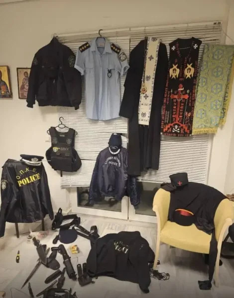 Στην έρευνα που έγινε στο σπίτι του 53χρονου, βρέθηκαν και κατασχέθηκαν ράσο και άλλα είδη ένδυσης ιερέα, εκκλησιαστικά είδη, εικόνες, ενώ εντοπίστηκαν και ρούχα με διακριτικά της ΕΛΑΣ.