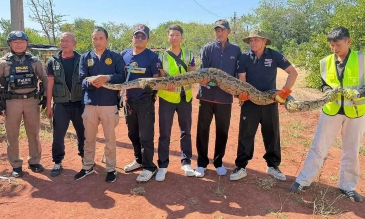 Μεγάλος πύθωνας σε δρόμο της Ταϊλάνδης καταγράφηκε και απελευθερώθηκε στη φύση αφού κατάπιε έναν σκύλο και έγινε πολύ αργός για να διαφύγει. Φωτογραφίες στα μέσα κοινωνικής δικτύωσης έδειχναν τους διασώστες να κρατούν το τεράστιο ερπετό μετά τον εντοπισμό του.