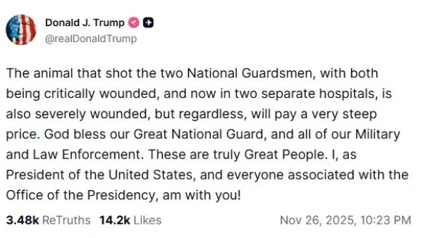 «Το κτήνος που πυροβόλησε τους δύο στρατιώτες της Εθνοφρουράς είναι σοβαρά τραυματισμένο, αλλά ανεξάρτητα από αυτό, θα πληρώσει πολύ ακριβά», έγραψε ο πρόεδρος των ΗΠΑ σε ανάρτησή του στο Truth Social.