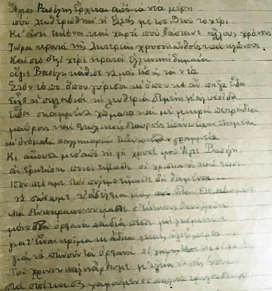 «Άγιος Βασίλης έρχεται από τα νέα μέρη, που λευτερώθηκ’ η Ελλάς με του Θεού το χέρι. Κι αντί εικόνα και χαρτί που βάσταν’ άλλους χρόνους, τώρα κρατεί τση λευτεριάς χρυσούς ανθούς και κλώνους.»